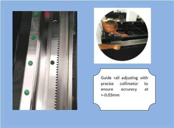 | Prénom:Moteur servo AC & pilote Le servomoteur importé (axe Y entraîné par deux servomoteurs) ainsi que le réducteur planétaire sophistiqué assurent un entraînement stable, précis et fiable. | |